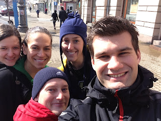 This past weekend, we had some special visitors. Three of our friends from Slovakia came to stay with us and watch us play. They called at about 1 am on Saturday to tell us that they were almost there so we went outside to meet them and help them find where we live. Originally, we were supposed to have shootaround at 11:00, but our coach cancelled it so that freed up Saturday morning to enjoy a big breakfast and show our friends around the city. After walking around a bit, we went to lunch at the restaurant where our team eats everyday. Then, we went back to our apartment to do a little dinner prep. After that, we took a quick nap before leaving for the game.